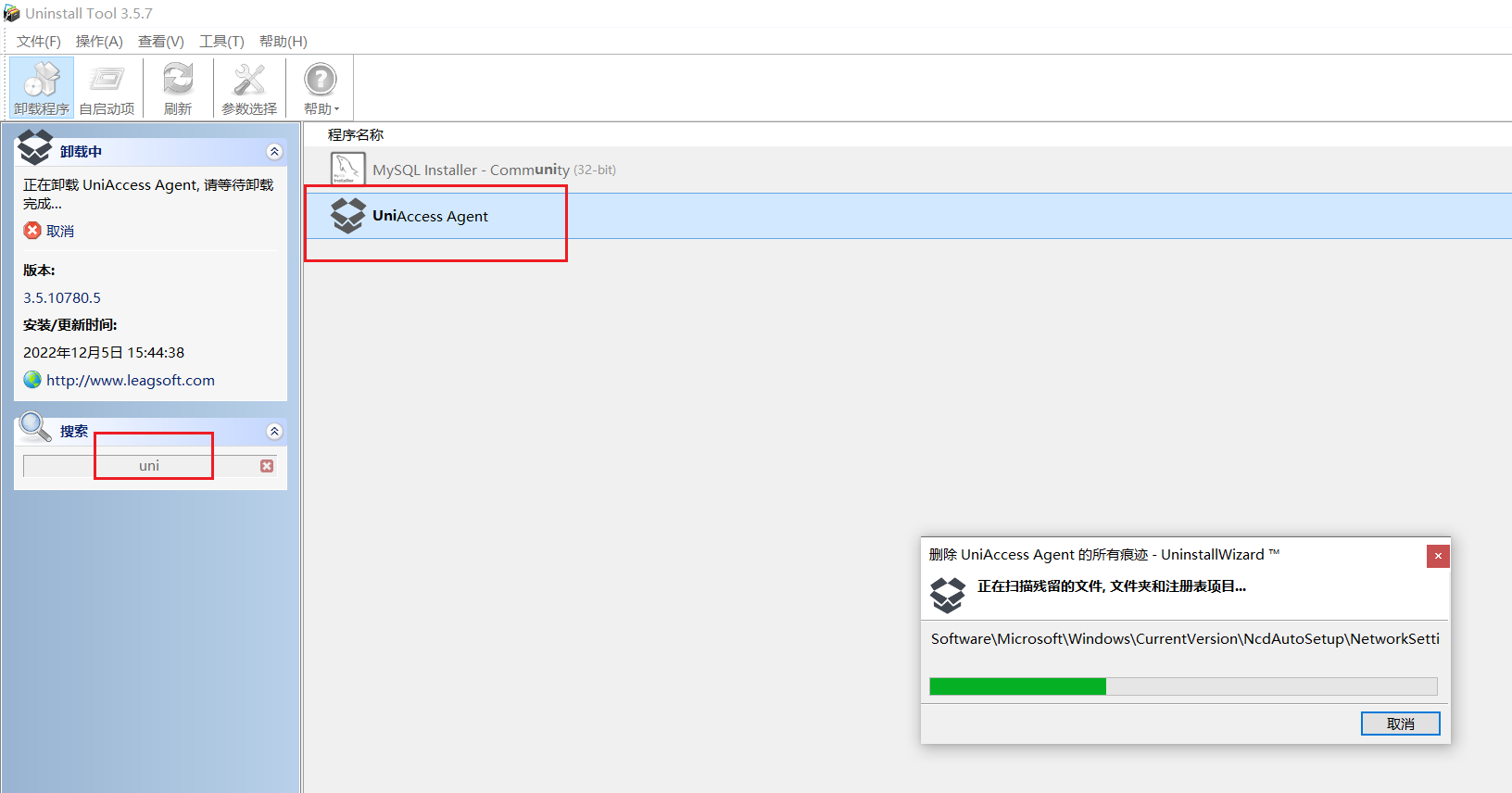 清理注册表等相关痕迹:使用卸载工具如Uninstall Tool搜索UniAccess Agent进行清理。