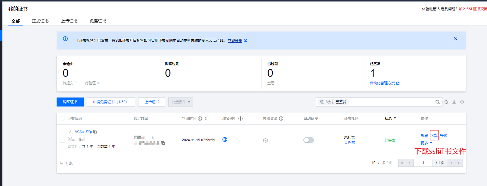 申请通过后,下载ssl证书文件将文件解压上传到服务器上